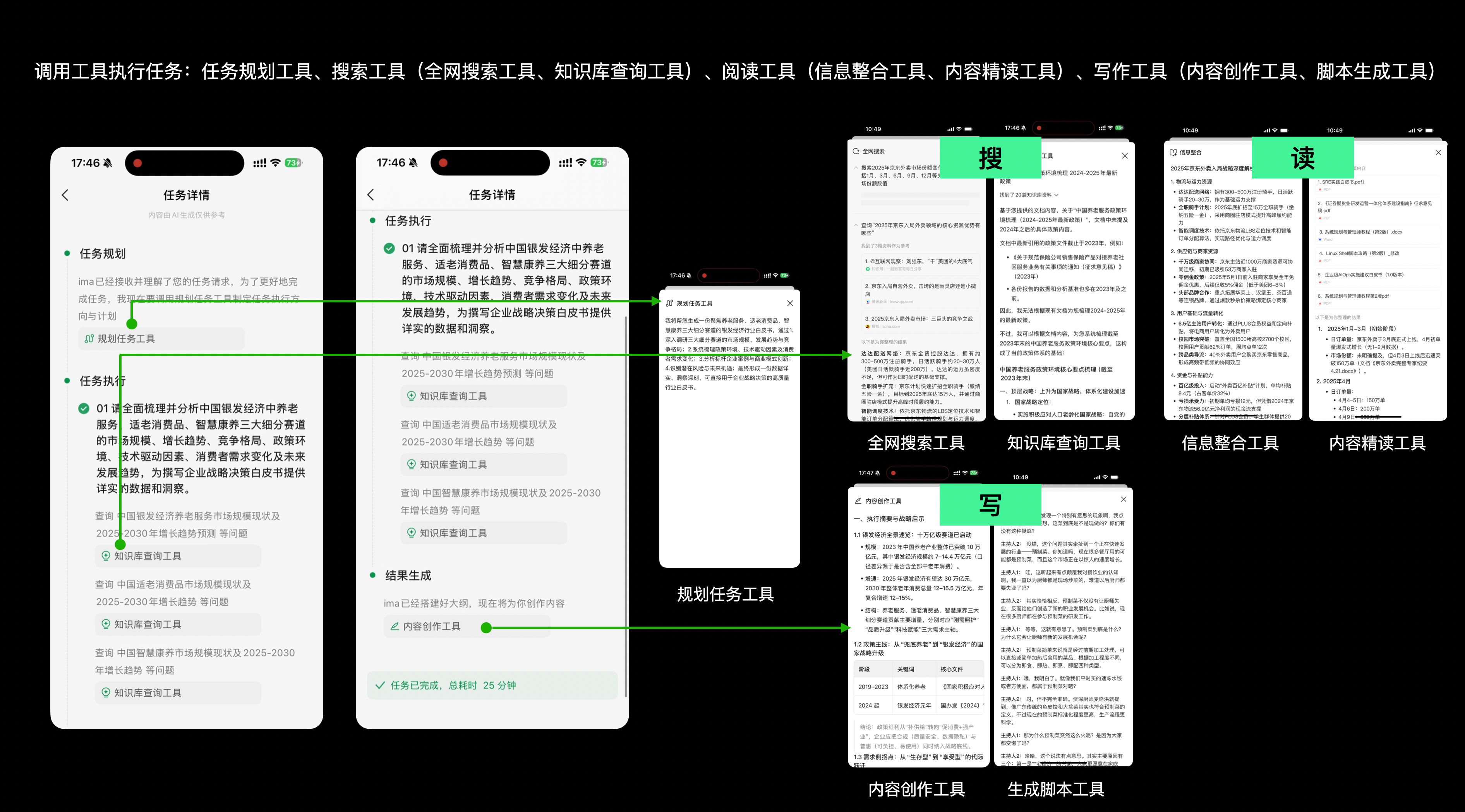 用户开启“任务模式”后,ima将基于全网或知识库数据,通过LLM自主拆解、规划任务步骤,并调用精读内容、全网搜索、知识库查询、内容创作等工具完成用户输入的指令,并在执行过程中自我监测与修正,最终产出可直接使用的结果。如输入“帮我写一份新能源汽车市场报告”“整理会议讨论的要点并生成纪要”“为我设计一节‘生成式 AI’教学播客”,拥有agent能力的“任务模式”,将深度学习和理解自然语言里的“藏”的任务,拆解规划成一个个工作节点,深度利用全网信息的“全”和知识库资料的“精”,将搜读写的工作流一体化。