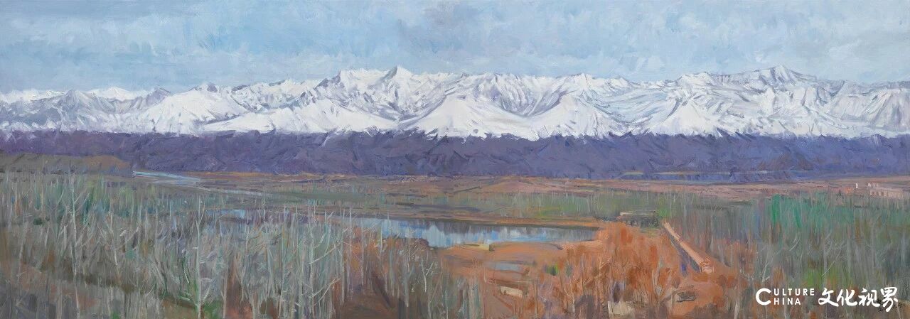 范迪安的画里没有悬空的抒情。《克孜尔的春雪》里的紫灰色调,不是凭空设定的高级感,而是源自他见过天山清晨的雾霭如何裹住山脉的记忆;画面中部的那抹灰紫,也不是单纯的色彩点缀,而是他蹲在克孜尔的山脚下,看着太阳即将越过山尖时,给连绵不断的山脉映照的那抹诗意。这种写实不是照相式的复刻,而是带着感受的写实,他保留了写生的现场感,让观众能从画里闻到草原的青草气、夯土建筑的土腥味,但更重要的是,他把这份“现场感”升华为“传神韵”。天山的雄浑不只是体积大,更是“能扛住岁月的厚重”;草原的辽阔不只是面积广,更是“能装下牧人生活的从容”。这种贴着大地生长的创作,让他的油画成了新疆的视觉备忘录,可以说,范迪安记录的不只是风景,还有风景里的人、人的生活、生活里的时代。