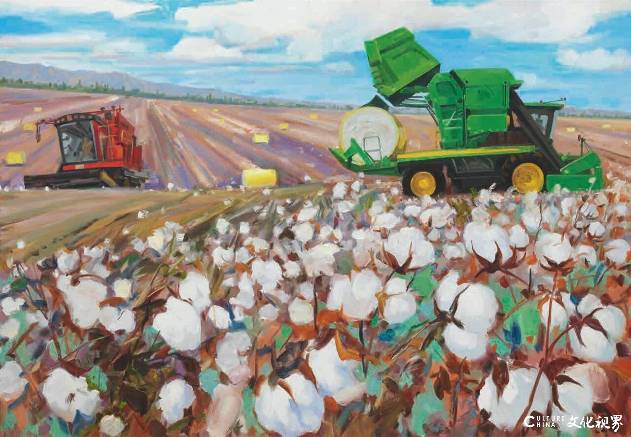 最典型的是《丰收棉田》。他用平视的角度画新疆的万亩棉田,没有按西方构成的思路,把棉田画成一片白,而是把白棉团、绿枝叶拆成一块块色块,像铺在地上的锦缎。画里一红一绿的采棉机,他没画得很大,却让它们成了“定海神针”。他就这么用油画的笔,写了东方的意,让不懂油画的新疆老乡能看懂“这画的是我们的地、我们的人”,也让懂艺术的人能读出“这是中国的油画,不是照搬西方的”。