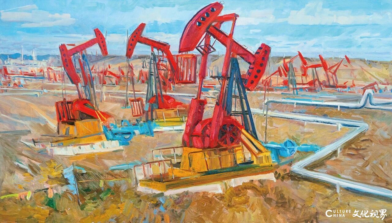 画自然,他画的是生态里的自然。不是只画天山的雪、草原的绿,而是画雪化了之后,草怎么冒芽;画草原上的牛羊,不是只画一群羊,而是画牛羊跟着炊烟走,炊烟连着蒙古包,这自然不是孤立的景,是“人住的地方”。画人文,他画的是活的人文。我们看到,在作品《克拉玛依油田》中,画家充分展现了油田的壮阔,抽油机成了画面的主角,它们分布在戈壁上,有的正在采油,有的静静矗立,金属的质感在阳光下格外清晰,远处是油田的厂房,烟囱里飘着淡淡的烟,与戈壁的灰黄形成对比;更远处,是连绵的天山,为工业景观增添了一份自然的厚重。观众虽然看到的是抽油机的“形”,读懂的却是新疆人战戈壁、建油田的奋斗故事。最打动人的是他画“时代的变”。